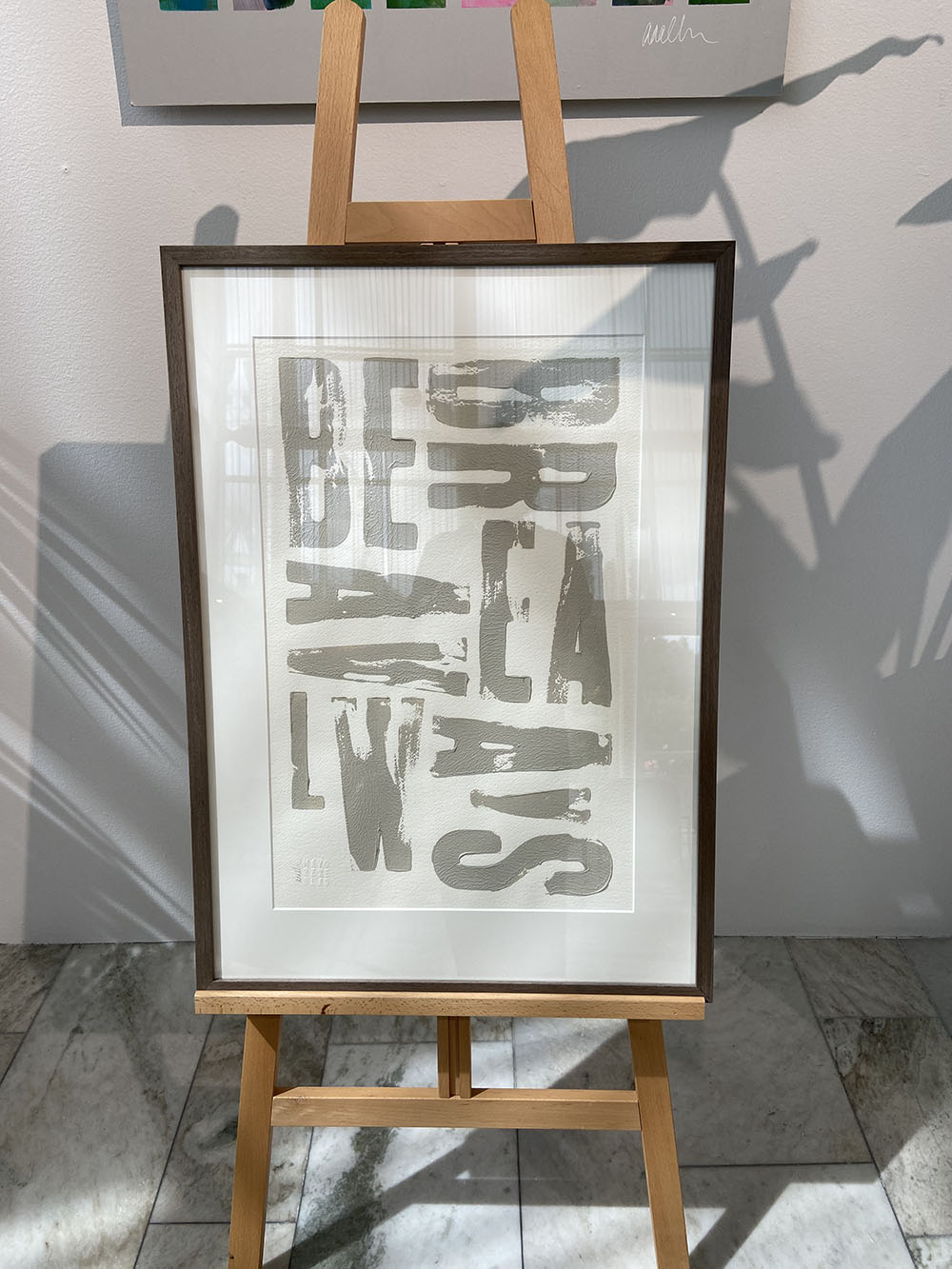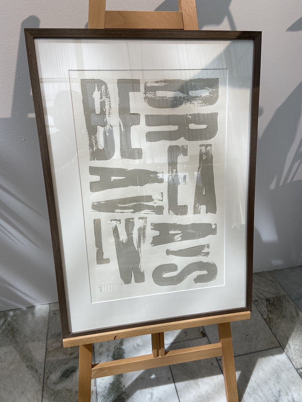 ”Be brave always” – Text, handtryckt med hjälp av antika trätyper. Beige akrylfärg på lyxigt akvarellpapper med grov gräng. Handskuren passepartout, handbyggd ram i ljus valnötsfanér och klassiskt glas.