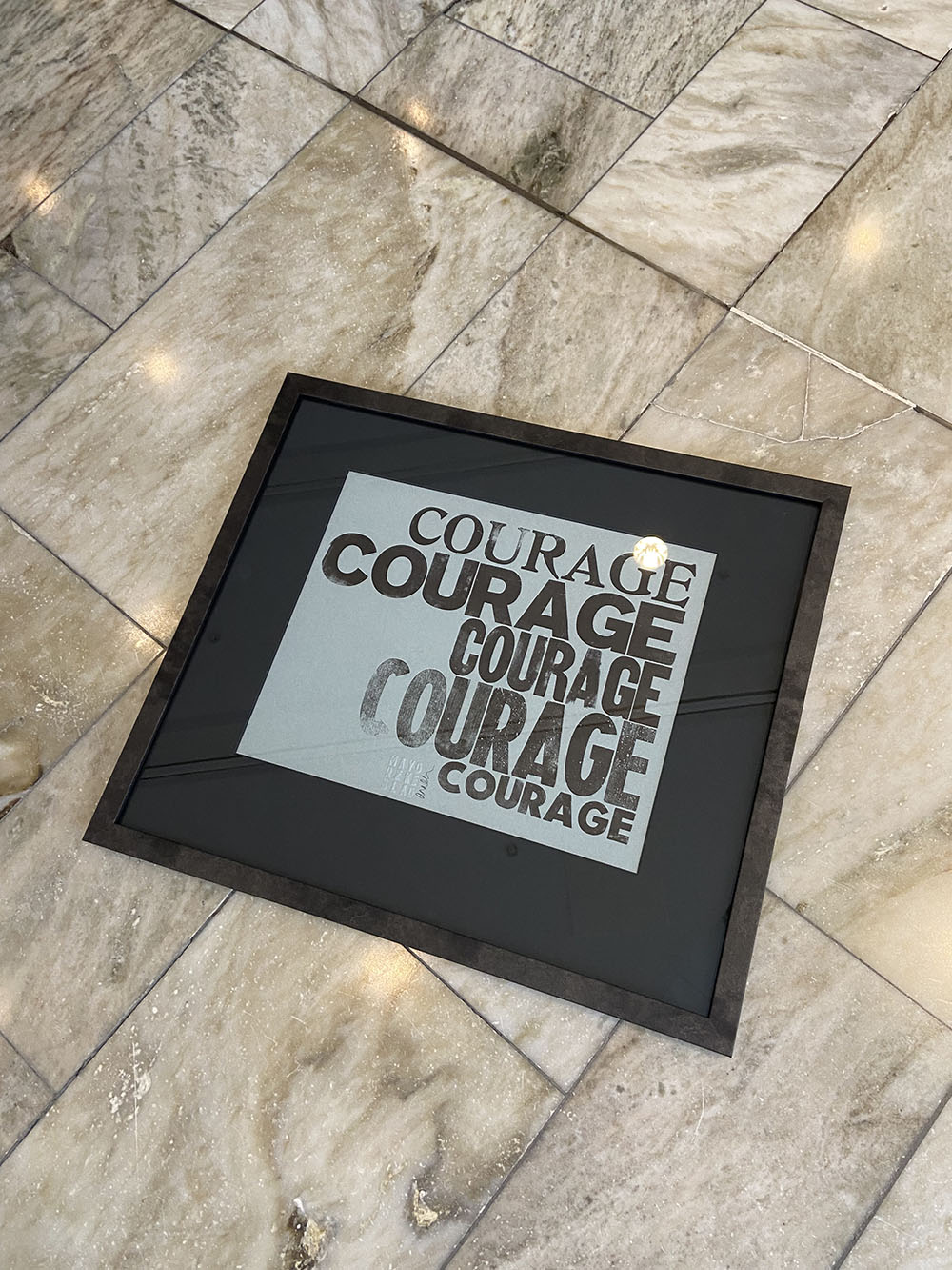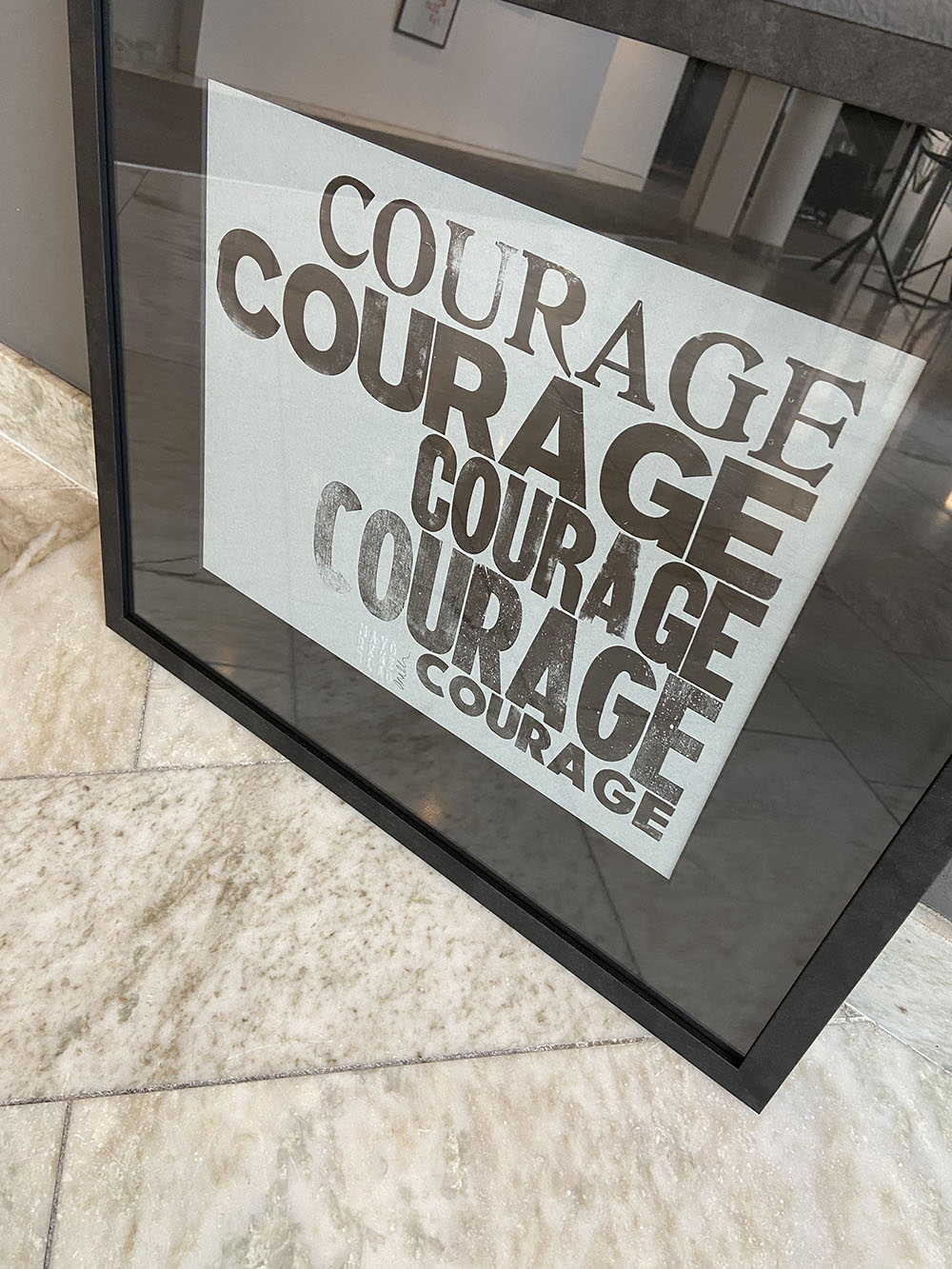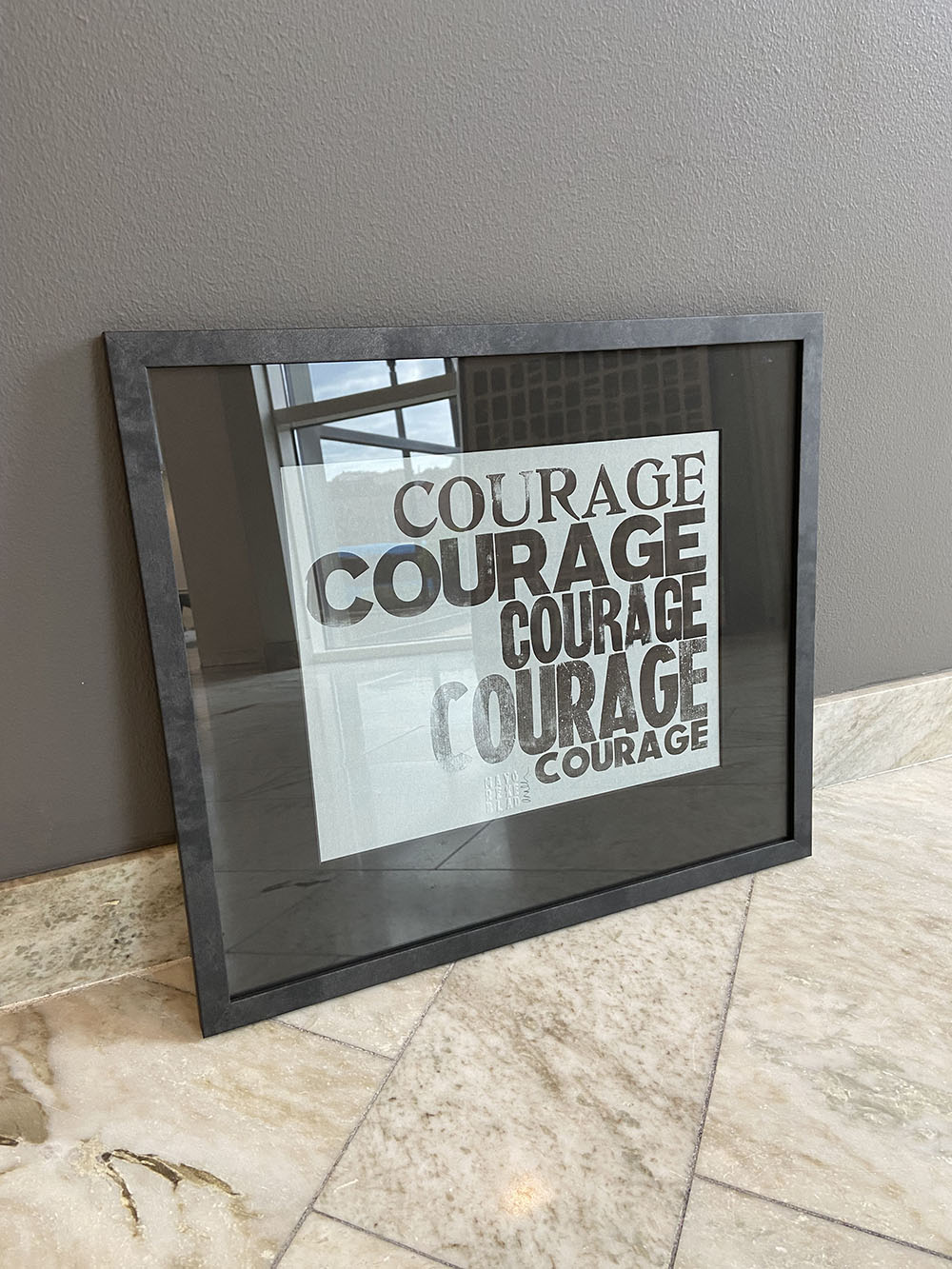 “Courage” – Text, hand painted using antique wooden types. Acrylic paint on thick water color paper. Hand made passepartout in black, frame in mat black and classic glass.